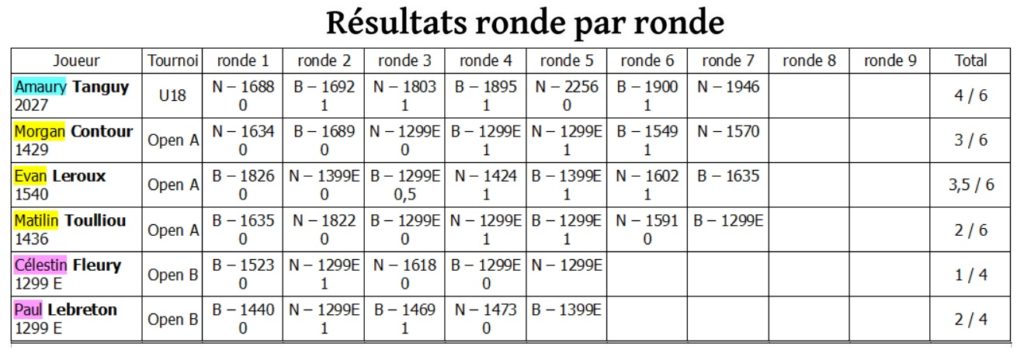 Les plus grands sont sur une bonne dynamique. Mercredi, Amaury a perdu contre Adrien Vu Dinh (2256) au terme d’une belle partie, mais il a retrouvé le chemin de la victoire jeudi et se retrouve à 4/6, un bon tournoi pour l’instant. Dans l’Open A, Matilin, Evan et Morgan ont tous gagné mercredi ! Leur tournoi est bien lancé, les efforts consentis commencent à payer. Jeudi, Evan et Morgan ont enchaîné avec une victoire supplémentaire (leur troisième d’affilée !), et ce contre un joueur mieux classé. Matilin a calé (défaite contre un joueur à 150 Elo … de plus) mais il reste dans le coup (2/6).