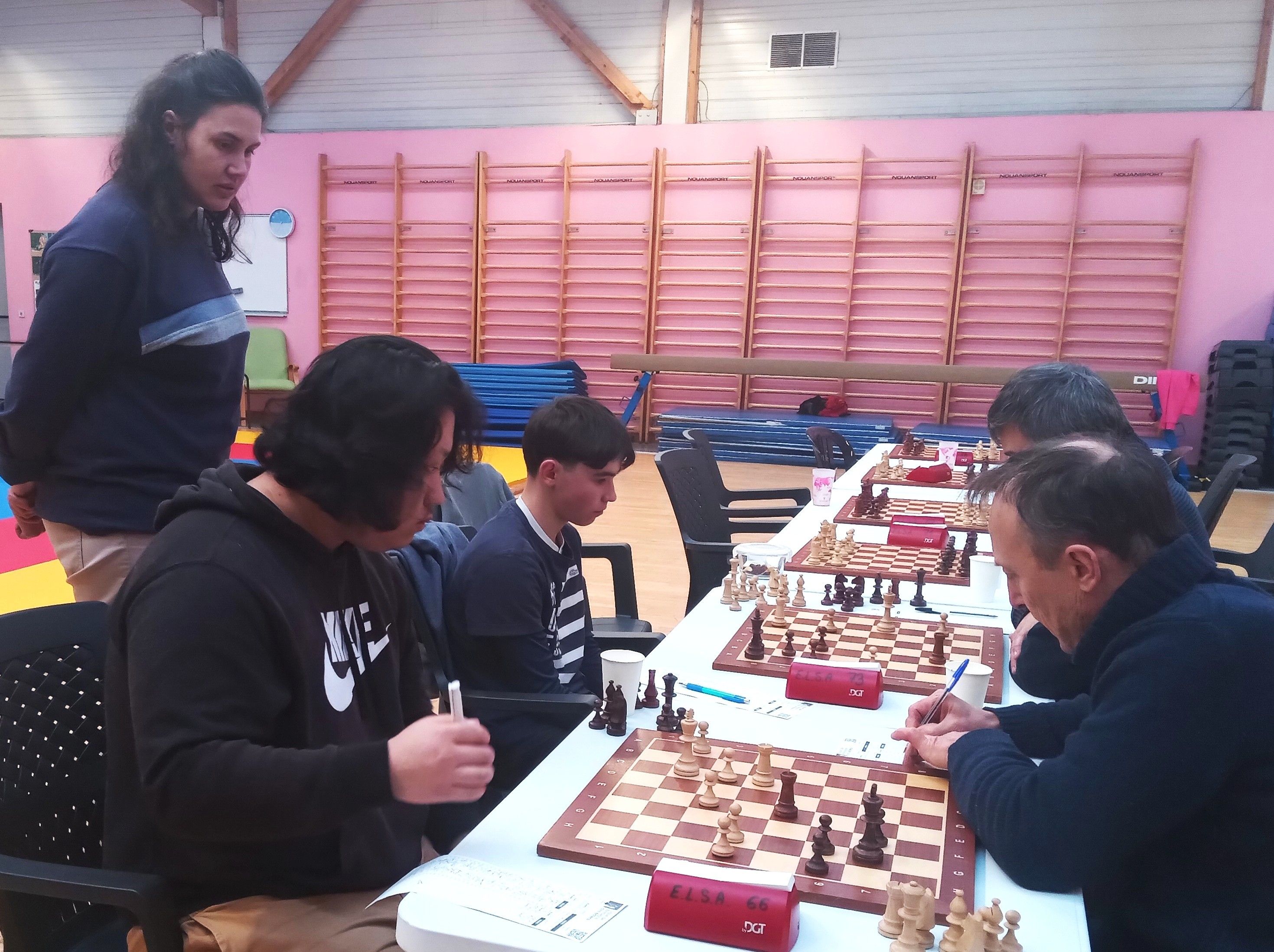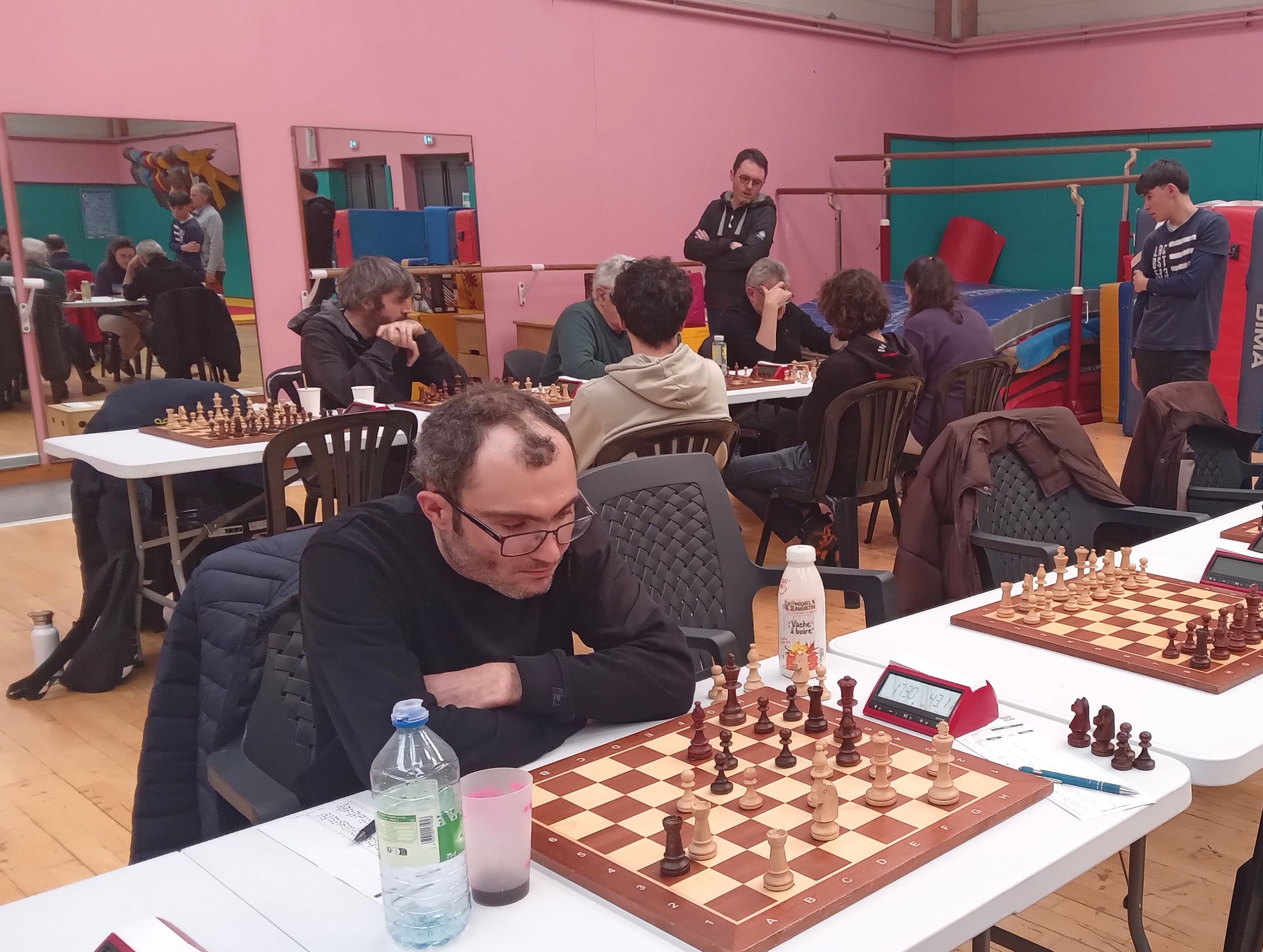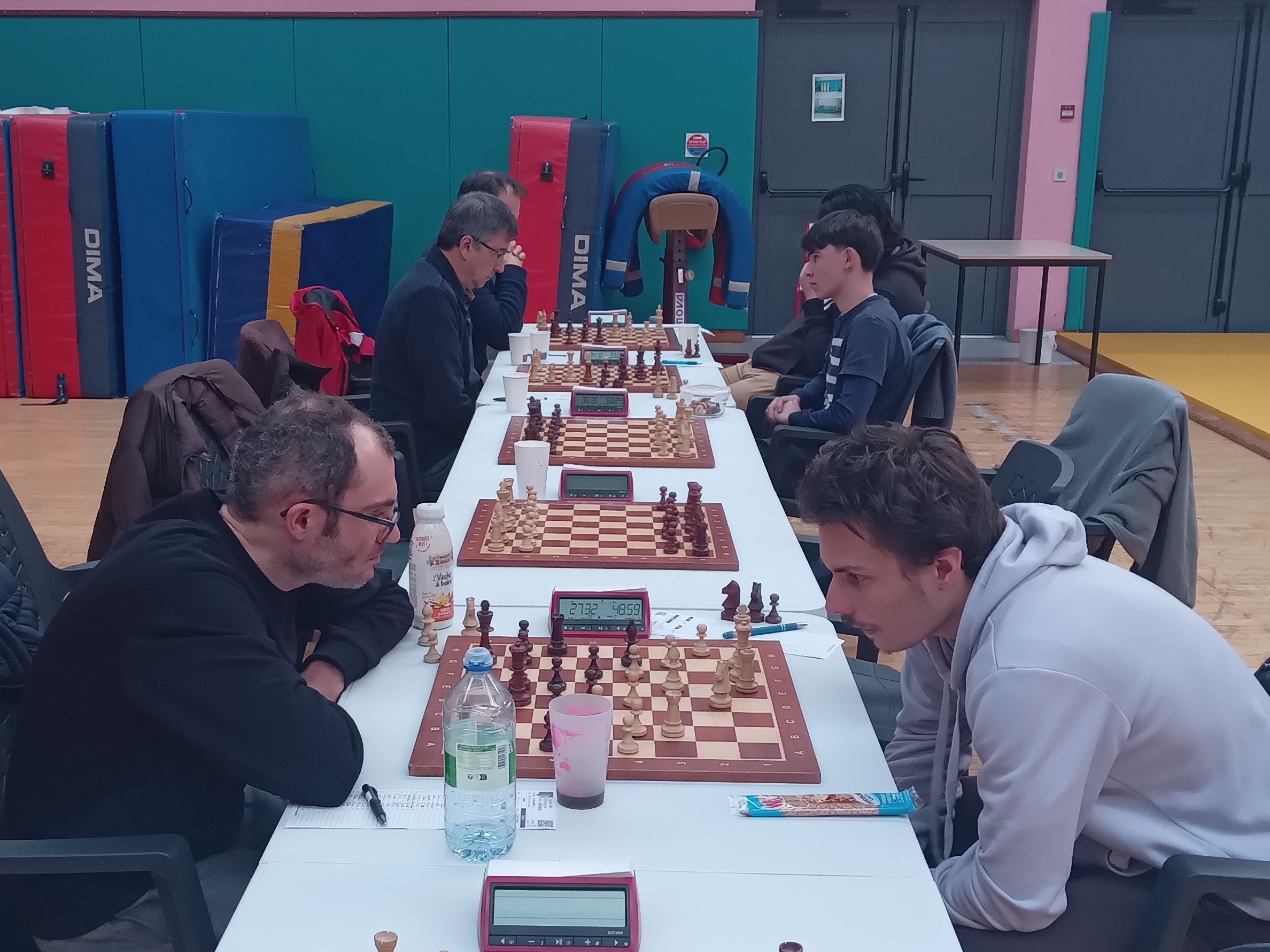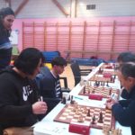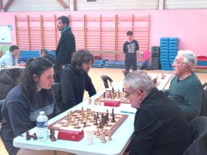 Enfin, l’équipe 3 poursuit son bonhomme de chemin en championnat départemental, avec un match nul honorable contre Muzillac 3. Titouan Klein, Célia Malry, Yannick Le Strat, Thomas Lepercq, Evan Leroux, Morgan Contour, Michel Le Corff, Quentin Santamaria, Henry Paris, Cyril Glangetas, Mathieu Jéhanno, c’étaient les onze joueurs utilisés dans l’équipe depuis le début de saison. Aujourd’hui, il a fallu ajouter trois nouveaux : Soliman Bac, de retour après un passage éclair il y a sept ans, Raphaël Baudet et Maxime Delaye, le futur du club et déjà son présent avec ce “baptême du feu” par équipes. Si la marche était trop haute pour Raphaël et Maxime, opposés à deux solides 1500 (Thomas Pascual et Goulwen Prono), Soliman s’est défait de Didier Rolez, et Célia a battu Philippe Le Collinet en finale. Une victoire qui fait du bien contre un joueur au même Elo.