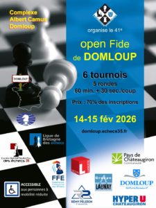 Evan Varin finit troisième de l’Open B, un tournoi piégeux pour lui qui avait le deuxième Elo avec 1821, mais où ses concurrents étaient tous à plus de 1670 Elo. Il marque 4 points sur 5, une très belle performance qui lui fait gagner 16 points Elo. Soliman Bac réussit son tournoi lui aussi : après une longue période d’inactivité, il a tenu le choc contre des joueurs mieux classés et inscrit 3 points (+13 points Elo)