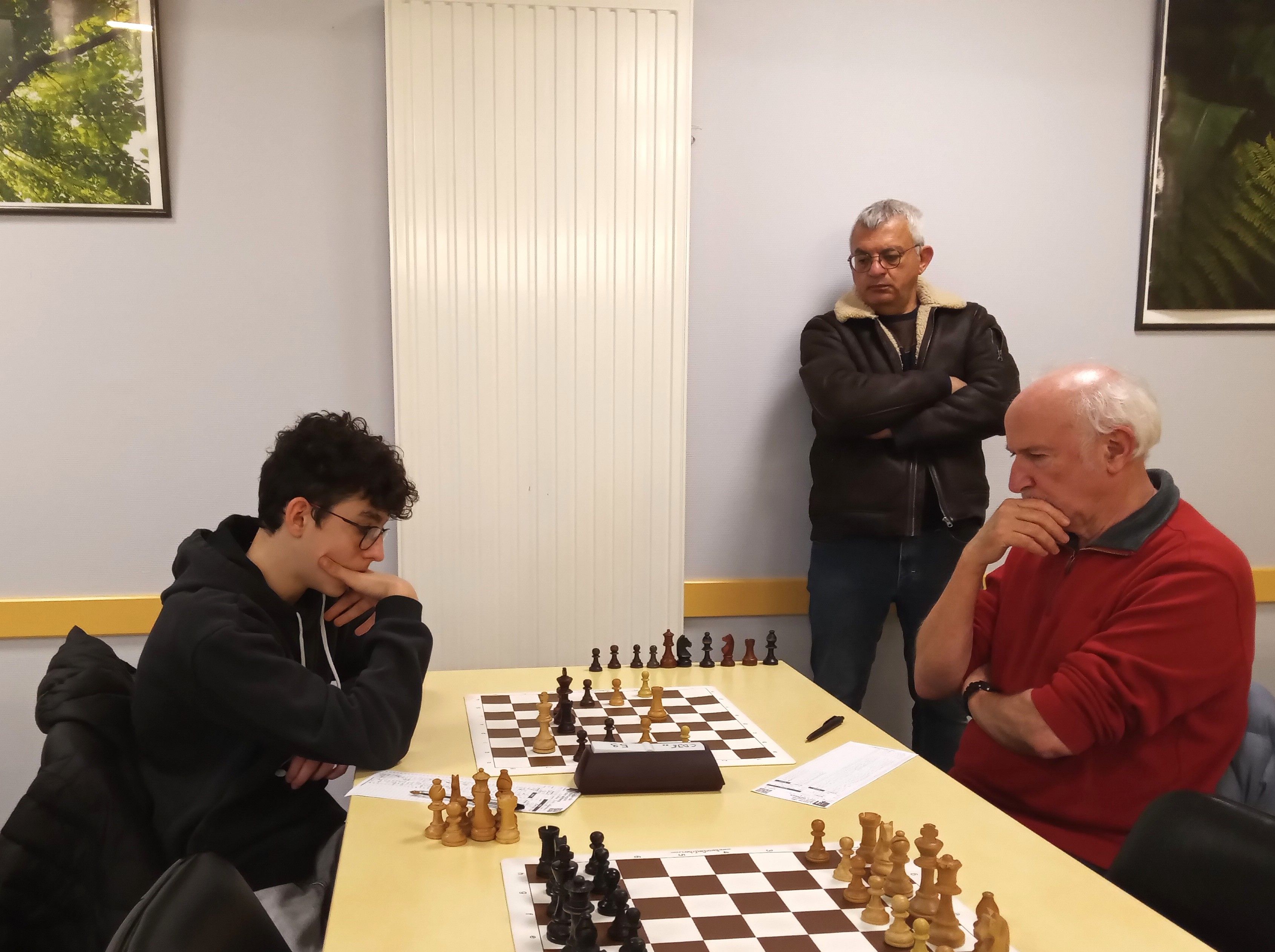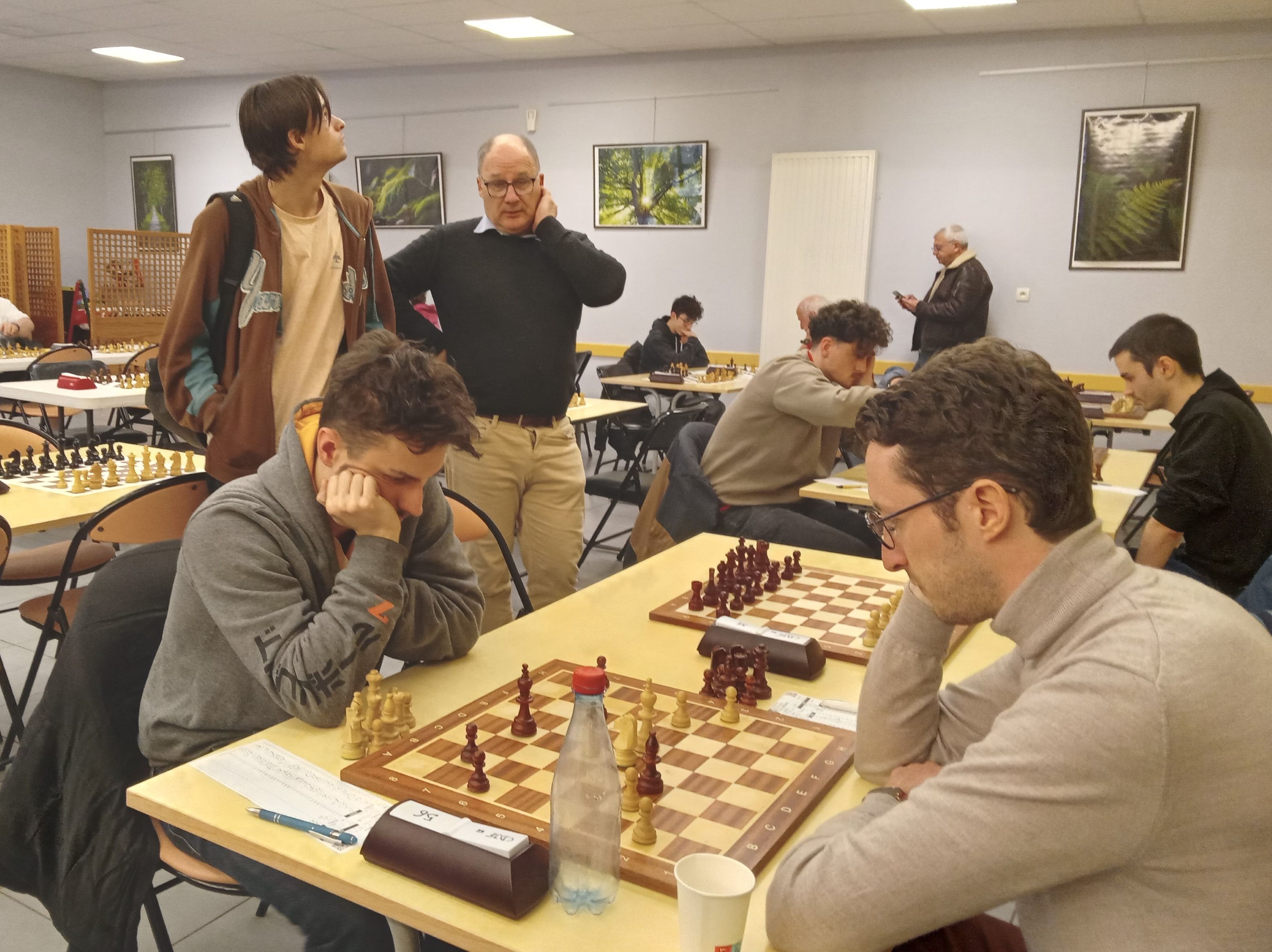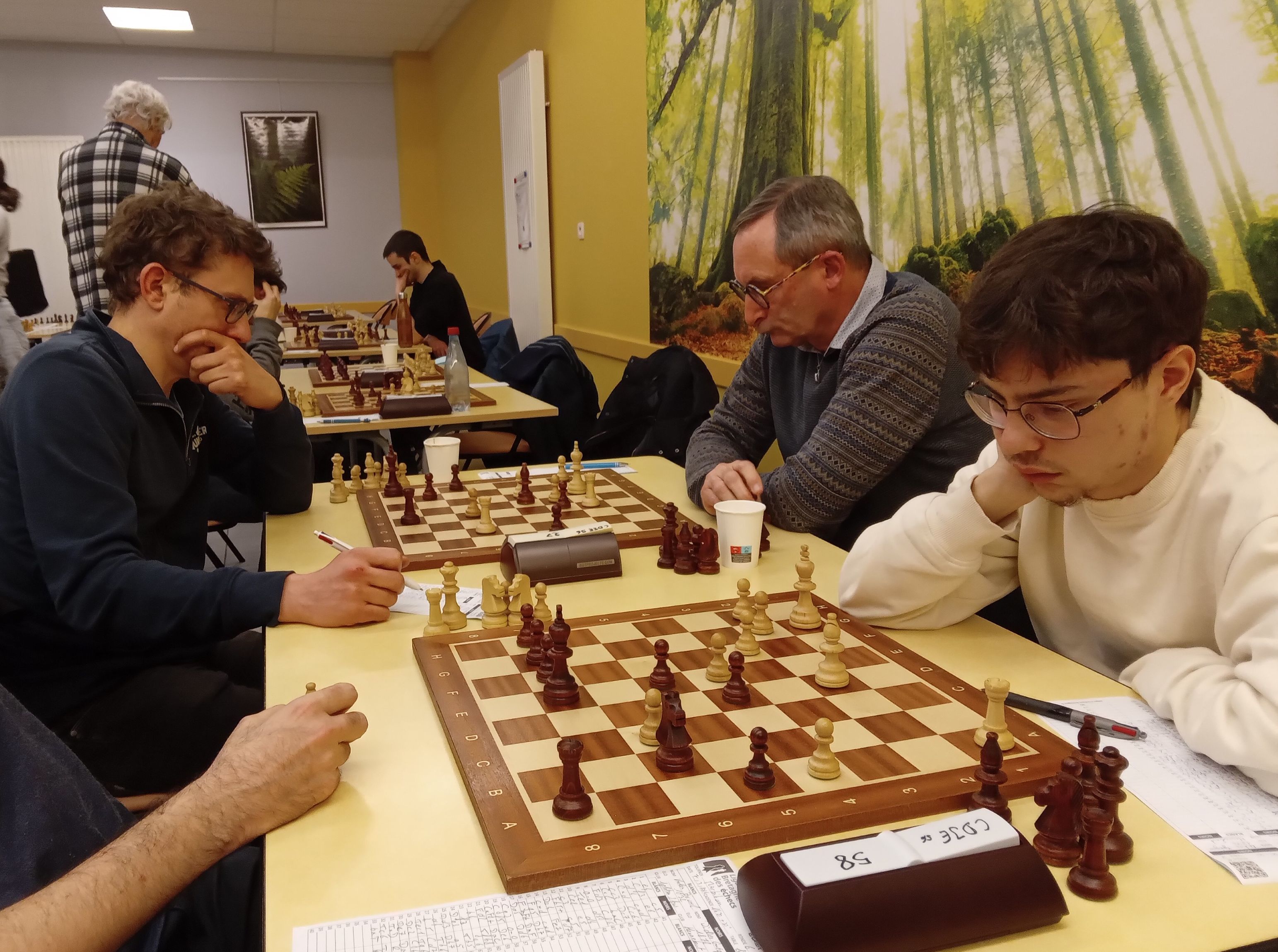 Retour à Théhillac pour les joueurs du Championnat du Morbihan, après la ronde 2 jouée dans la même salle en novembre. Le tournoi en est à la sixième ronde, et on peut déjà annoncer que le vainqueur final figure parmi ces quatre noms : Boris Eustache, le mieux placé avec 5,5 points suite à sa victoire contre Mawloud Omar, et trois joueurs à cinq points : Louis Gordon, Enzo Le Forestier, et donc Amaury Tanguy.