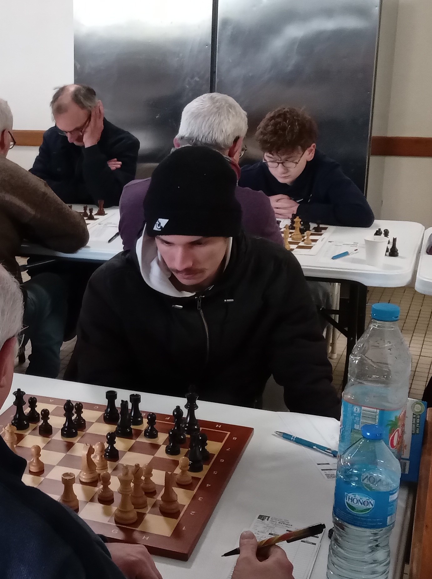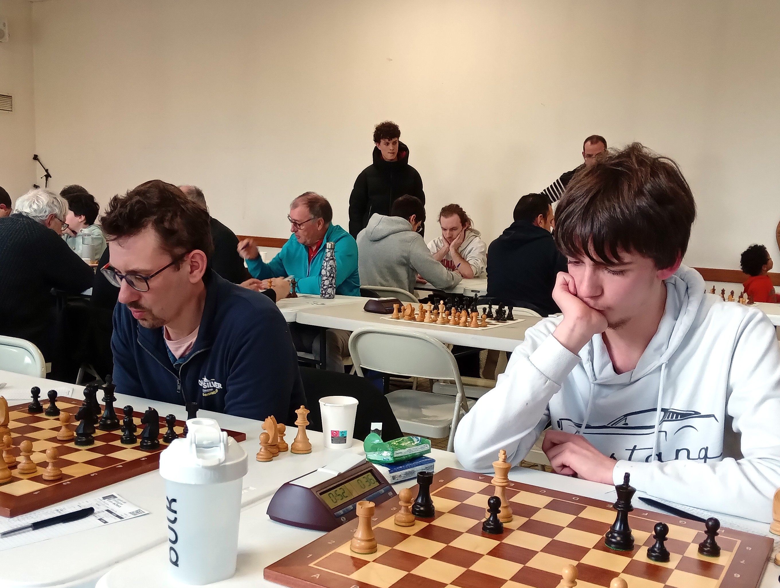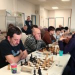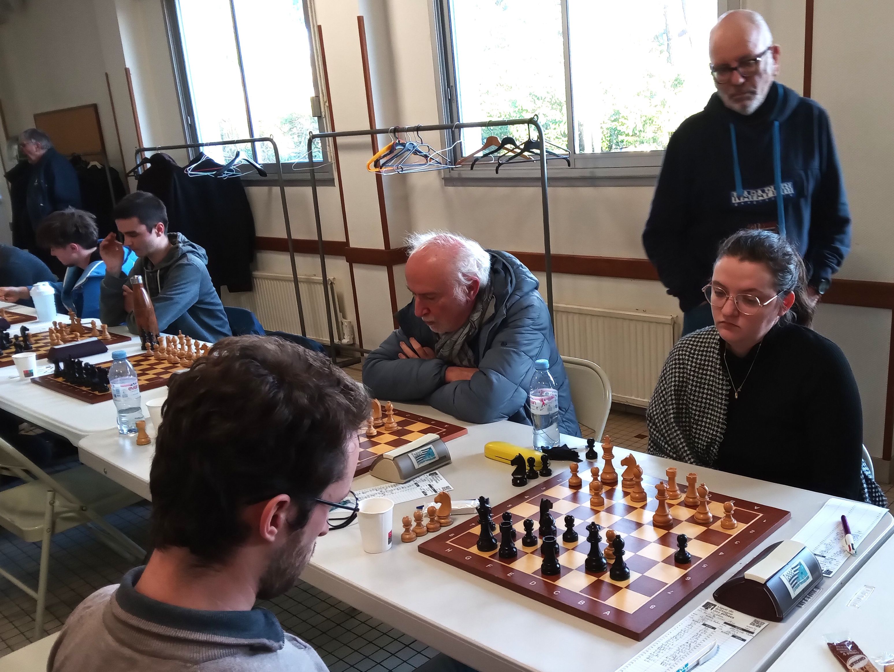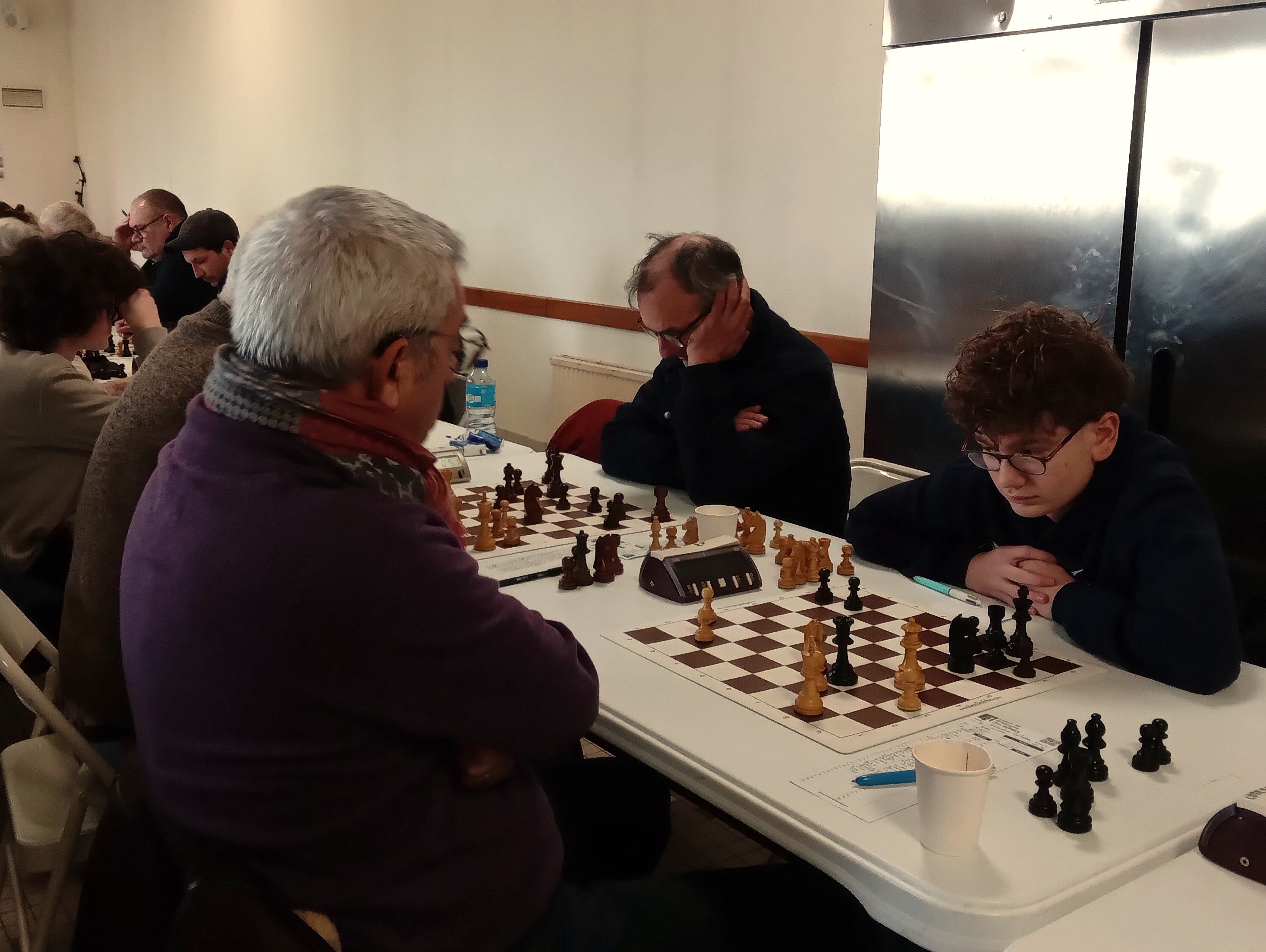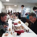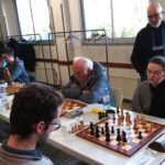 Il est accompagné par Evan L, vainqueur rapide de Philippe Le Roy, et Célia, qui n’a pas tremblé pour faire valoir sa pièce de plus contre Gilles Larue. 2 points aussi pour Alan, qui jouait table 8 mais n’a pu se défaire d’Alain Germès (1932). Bonnes victoires de Soan contre Daniel Criado et de Quentin contre Fabien Charpentier, défaites de Loïc, opposé à Cyrille Garans, et de Michel, battu par Denis Guillemoto.