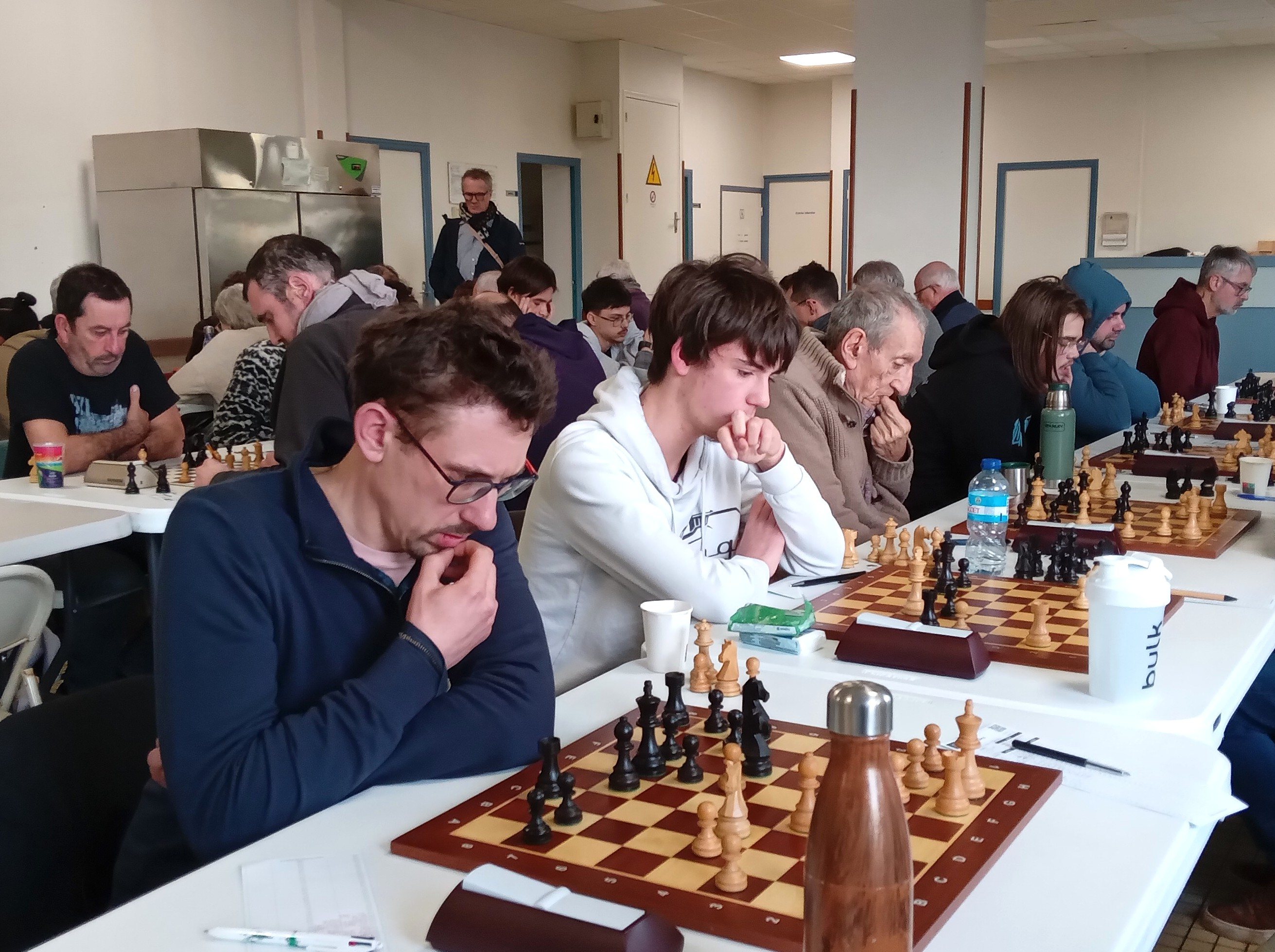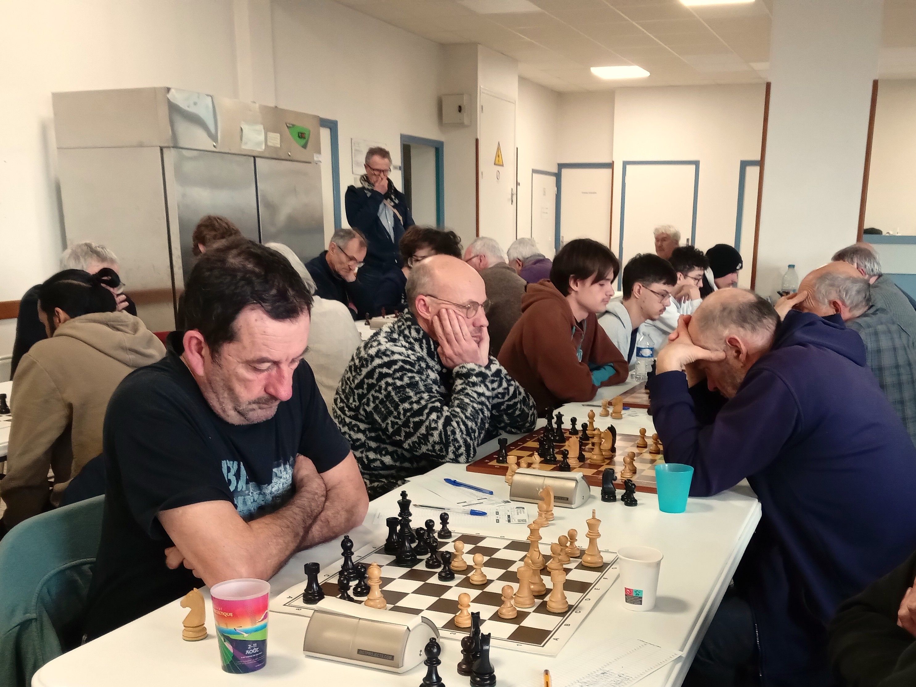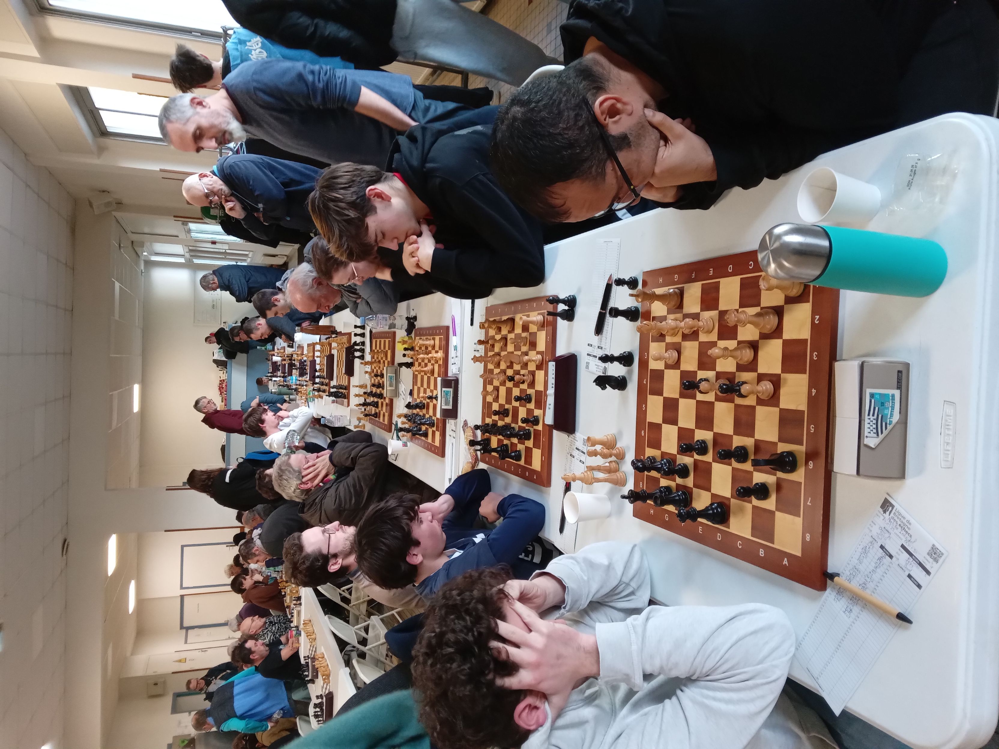 Il est accompagné par Evan L, vainqueur rapide de Philippe Le Roy, et Célia, qui n’a pas tremblé pour faire valoir sa pièce de plus contre Gilles Larue. 2 points aussi pour Alan, qui jouait table 8 mais n’a pu se défaire d’Alain Germès (1932). Bonnes victoires de Soan contre Daniel Criado et de Quentin contre Fabien Charpentier, défaites de Loïc, opposé à Cyrille Garans, et de Michel, battu par Denis Guillemoto.