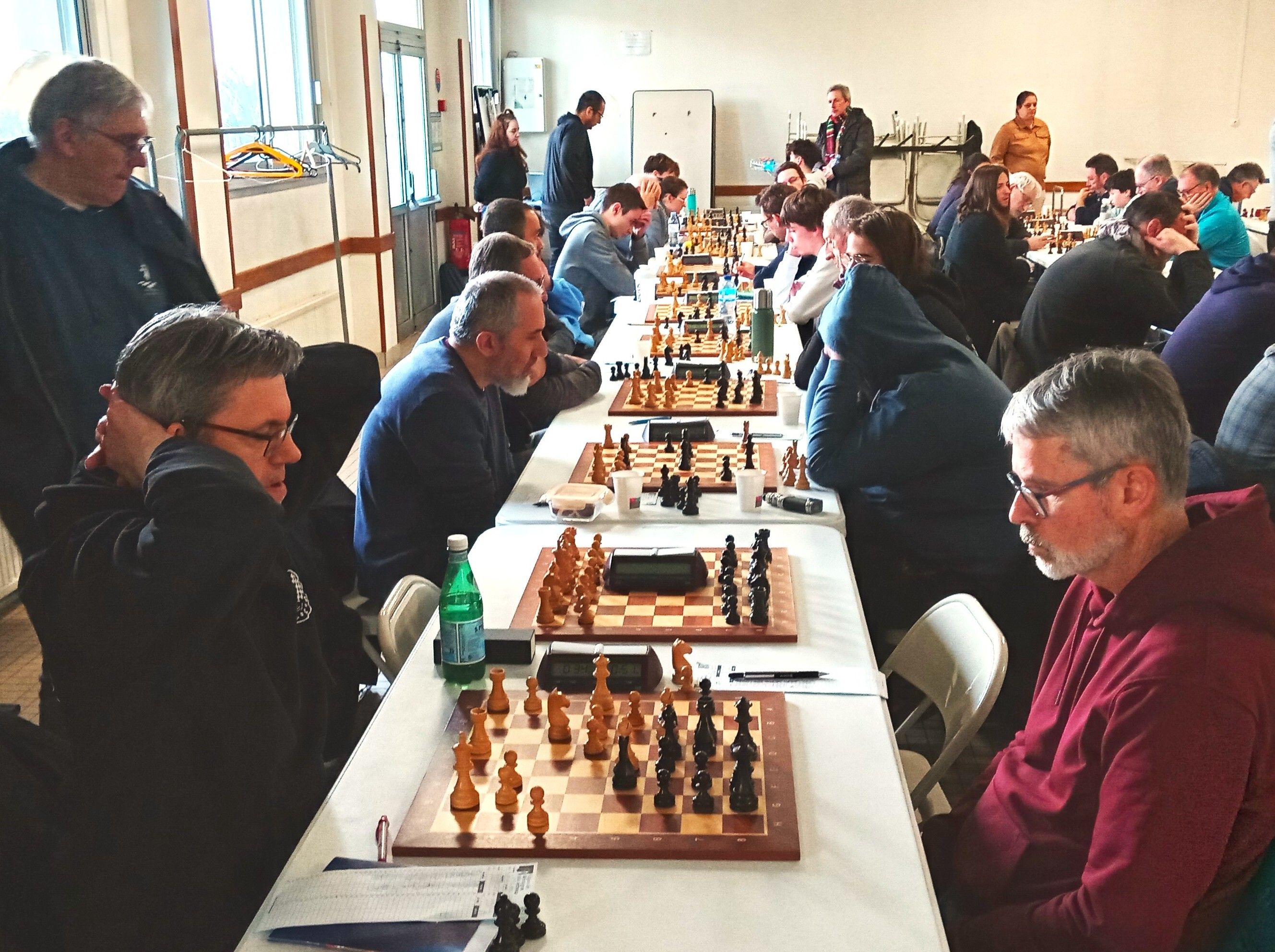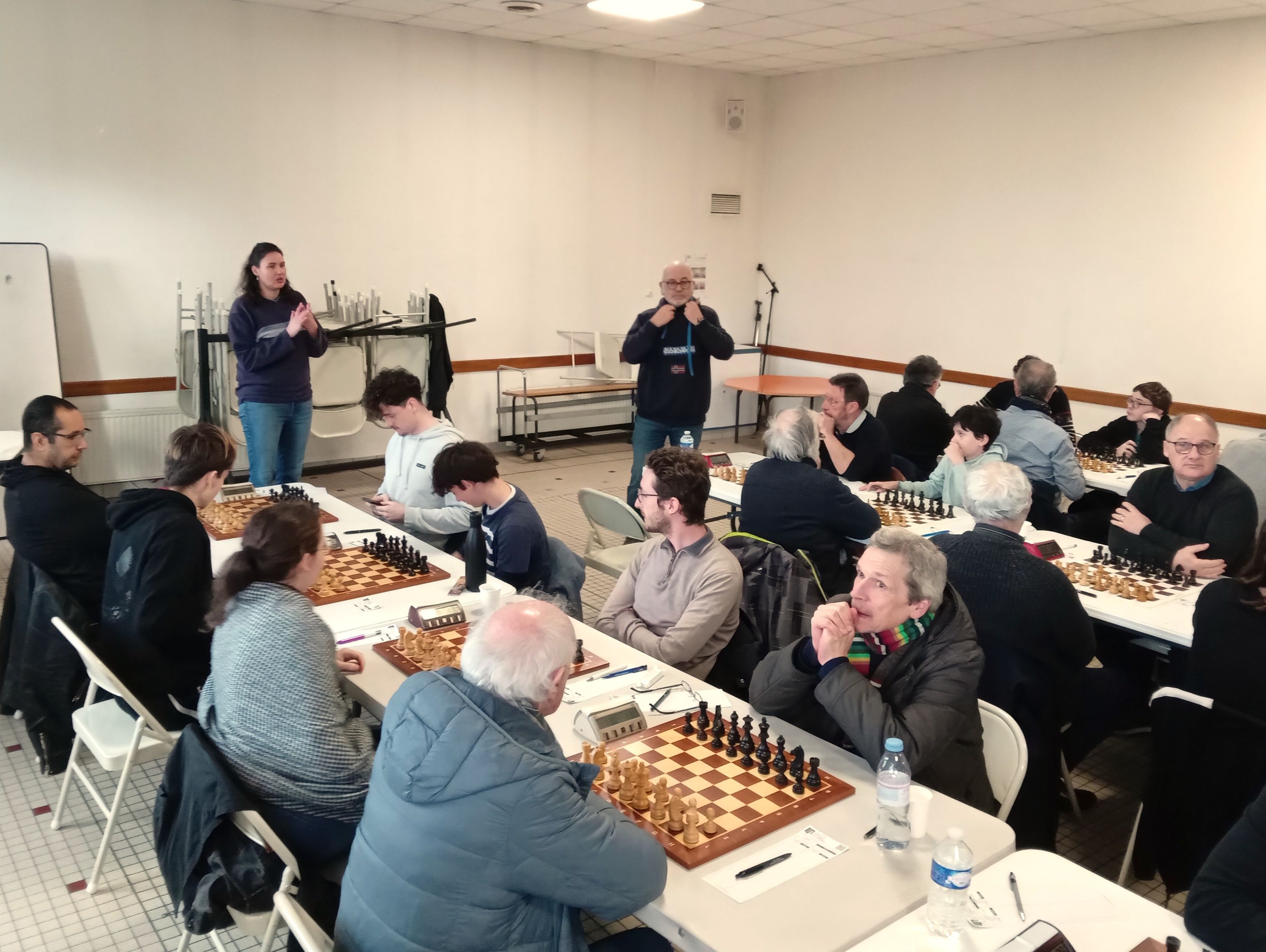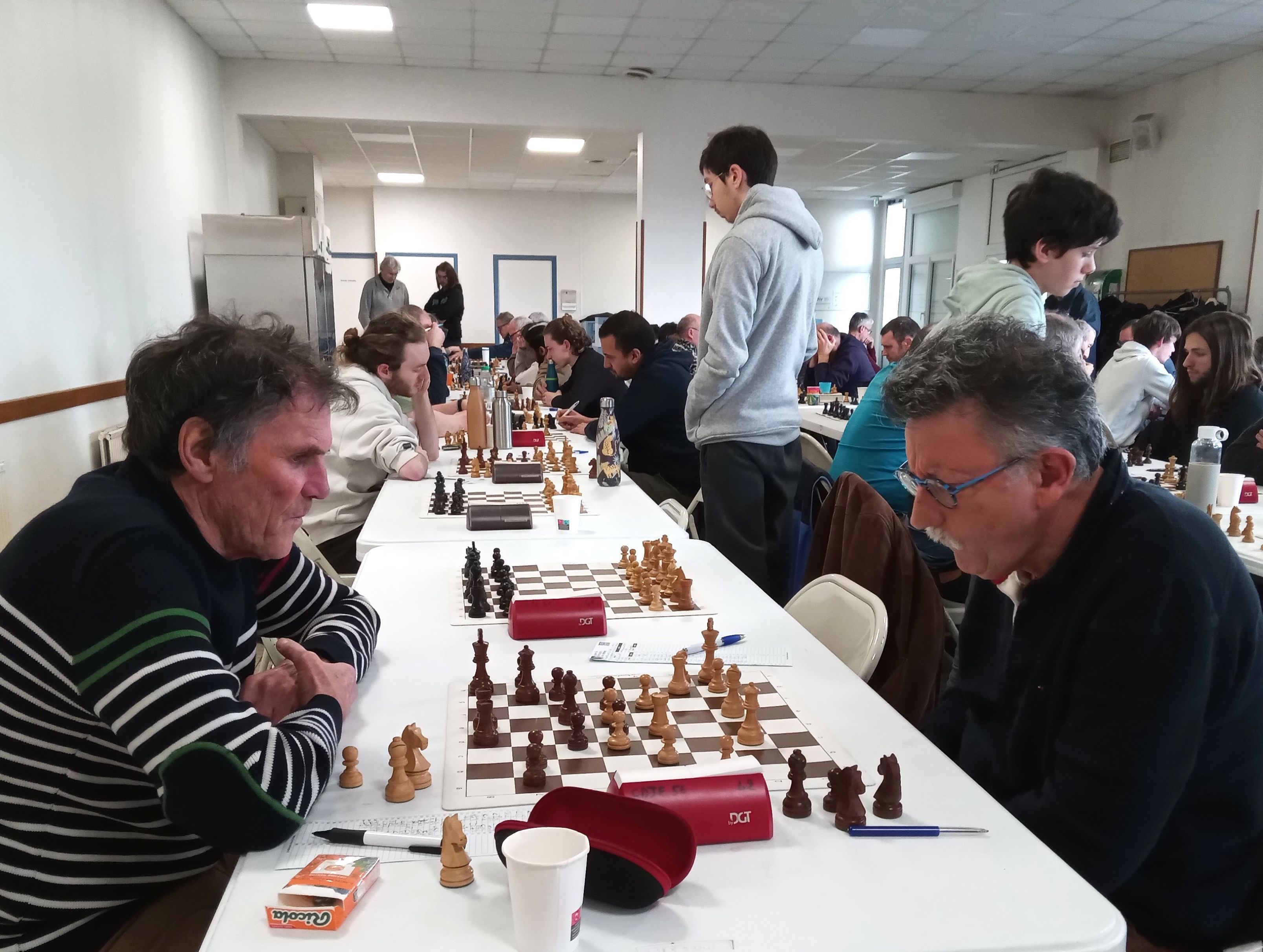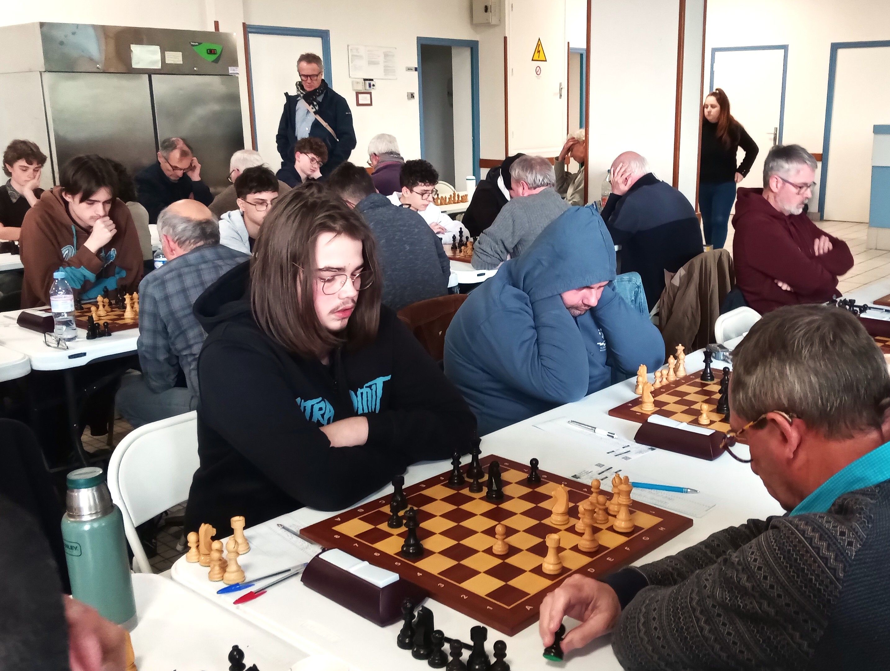 Il est accompagné par Evan L, vainqueur rapide de Philippe Le Roy, et Célia, qui n’a pas tremblé pour faire valoir sa pièce de plus contre Gilles Larue. 2 points aussi pour Alan, qui jouait table 8 mais n’a pu se défaire d’Alain Germès (1932). Bonnes victoires de Soan contre Daniel Criado et de Quentin contre Fabien Charpentier, défaites de Loïc, opposé à Cyrille Garans, et de Michel, battu par Denis Guillemoto.